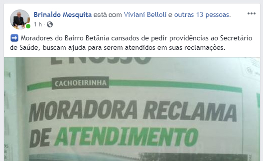 Brinaldo diz na sua postagem: “Moradores do Bairro Betânia cansados de pedir providências ao Secretário de Saúde, buscam ajuda para serem atendidos em suas reclamações.”