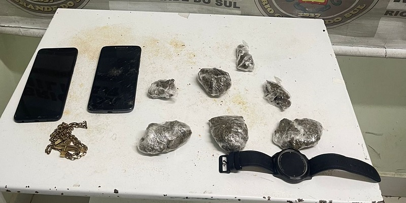 Durante a revista ao interior do Peugeot, os policiais apreenderam 5 pinos de cocaína, 07 porções de maconha e 02 telefones celulares. O condutor do carro recebeu voz de prisão e encaminhado para exames médicos de rotina na Unidade de Pronto Atendimento (UPA) 24h Francisco de Medeiros e posteriormente apresentado à Delegacia de Polícia de Pronto Atendimento (DPPA) de Gravataí para o registro da ocorrência policial. O veículo foi recolhido para o depósito do DETRAN.