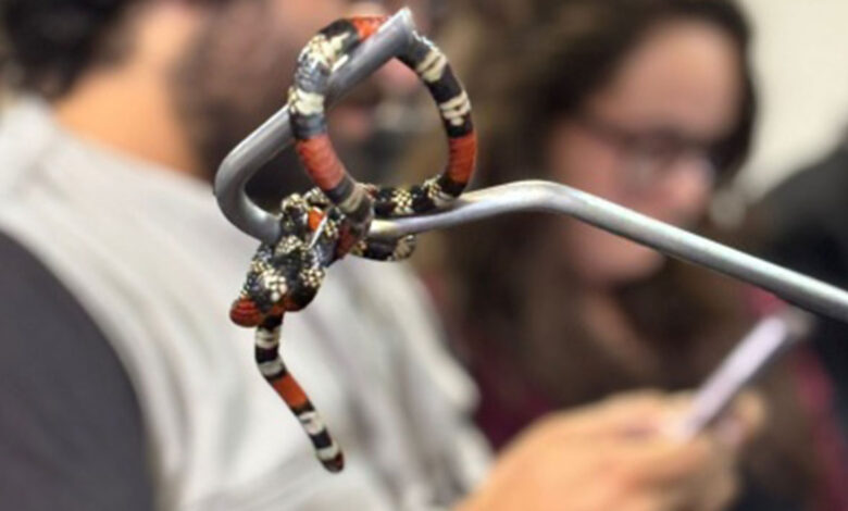 Durante o treinamento, os profissionais tiveram contato direto com serpentes, aranhas e escorpiões vivos, proporcionando experiência prática no reconhecimento das espécies e aprendizado de técnicas seguras de manejo.