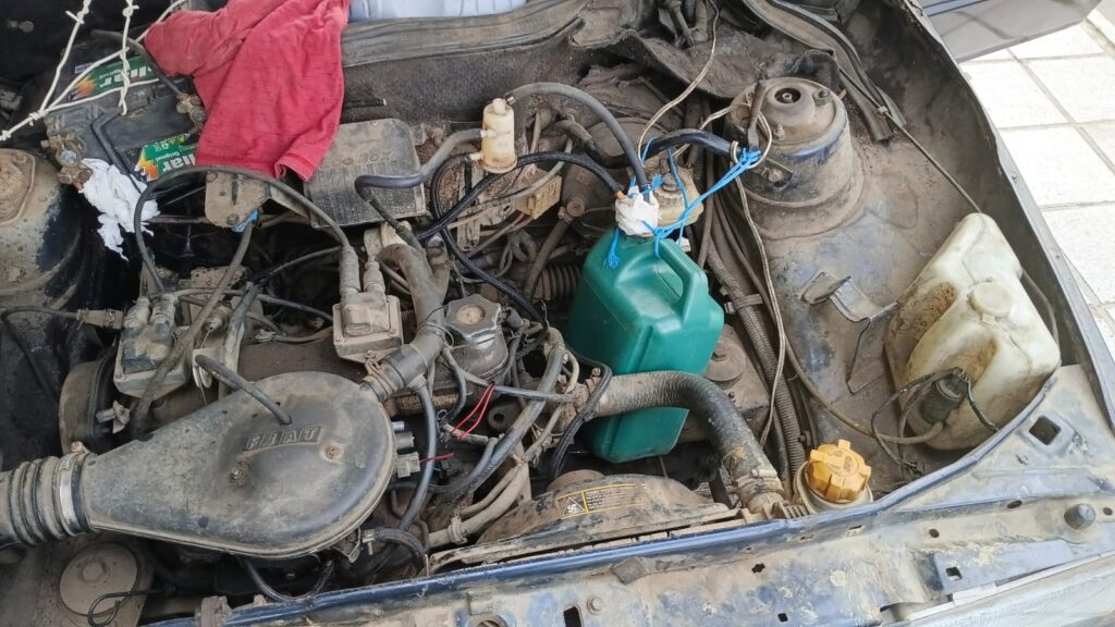 Segundo os agentes de transito, ao chegarem no local, eles confirmaram que o veículo estava sobre a calçada e iniciaram a verificação. Durante a fiscalização, foram constatadas outras irregularidades. Entre elas, pontos de corrosão severa na lataria e desgaste nos pneus. Ao abrirem o compartimento do motor, os agentes identificaram adaptações, como a bateria presa com fios e pedaços de plástico. Também foi encontrado um galão plástico de cinco litros, originalmente utilizado para armazenar água sanitária, sendo usado como reservatório.