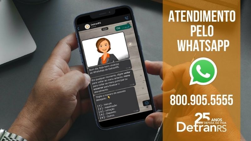 O DetranRS passa a ter mais um canal de atendimento ao cidadão. Agora é possível buscar informações e tirar dúvidas pelo WhatsApp, além do Disque-Detran, do Fale Conosco, do Chat e da Ouvidoria.
