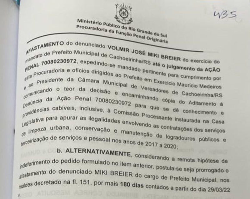Cachoeirinha – O Ministério Público quer o afastamento do prefeito Miki Breier do cargo até o julgamento da ação penal por supostas irregularidades no contrato com a SKM Empreendimentos, empresa que era responsável pela varrição e limpeza de ruas e praças. Como alternativa ao pedido, caso ele não seja aceito, foi solicitada a prorrogação do afastamento do cargo por mais 180 dias.