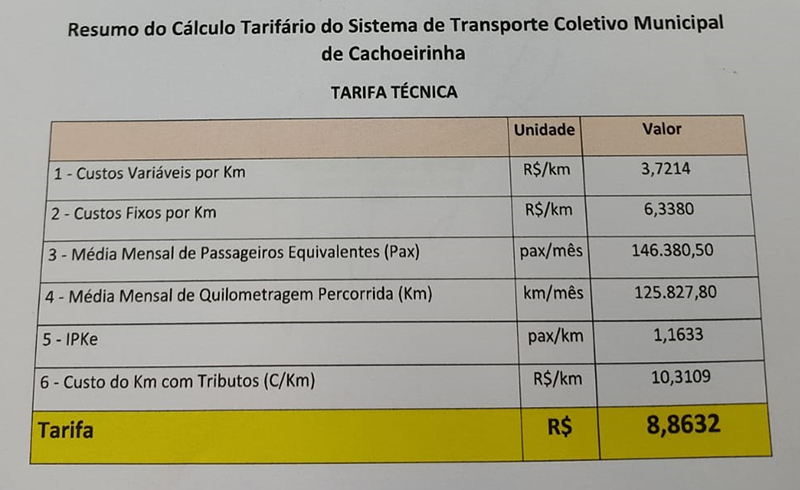 A tarifa técnica possui uma fórmula que leva em conta uma série de indicadores. Uma nota técnica elaborada pelo departamento de transporte público da secretaria de Mobilidade e Segurança mostra que o principal insumo da cesta de custos é o óleo diesel. Nestes quatro meses, o aumento foi de 38,95%. Pneus, chassi, carroceria, mão de obra, seguros, taxas de inspeção da frota também tiveram aumento.