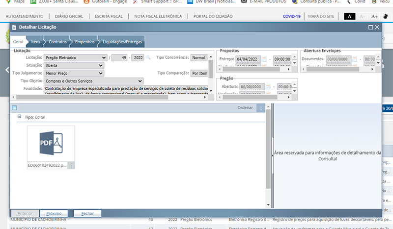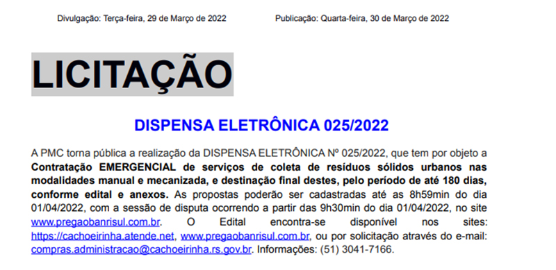 Nesta quarta-feira (30), contudo, o Diário Oficial da Prefeitura traz um edital anunciando a dispensa eletrônica com disputa em pregão eletrônico para a contratação emergencial de empresa para a prestação do mesmo serviço. O pregão está programado para a próxima sexta-feira (1), ou seja, as empresas interessadas terão poucas horas para elaborarem e apresentarem as propostas. A modalidade de dispensa eletrônica está prevista no artigo 75 da nova lei das licitações e contratos nº 14.133/2021.